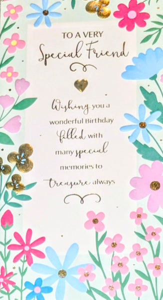 A slim size Birthday card, To a very special friend , with a full colour picture insert and a lovely verse.