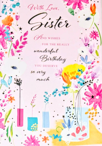 A bigger size Birthday card, With Love Sister, with a full colour picture insert and a lovely verse.